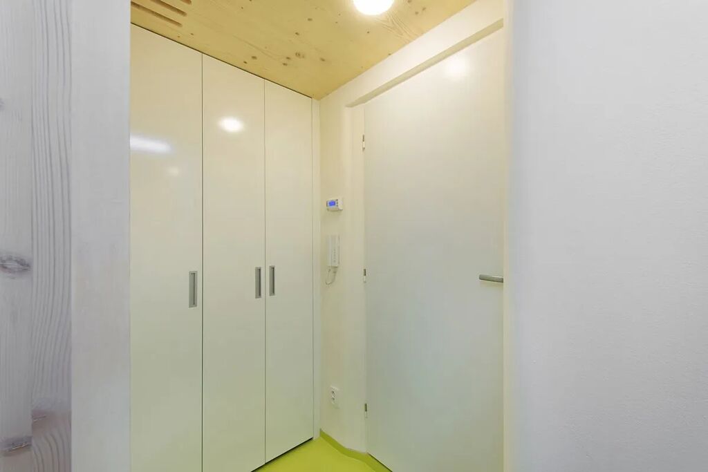 Originální a promyšlené dispoziční řešení s příjemnými překližkovými dřevěnými prvky.