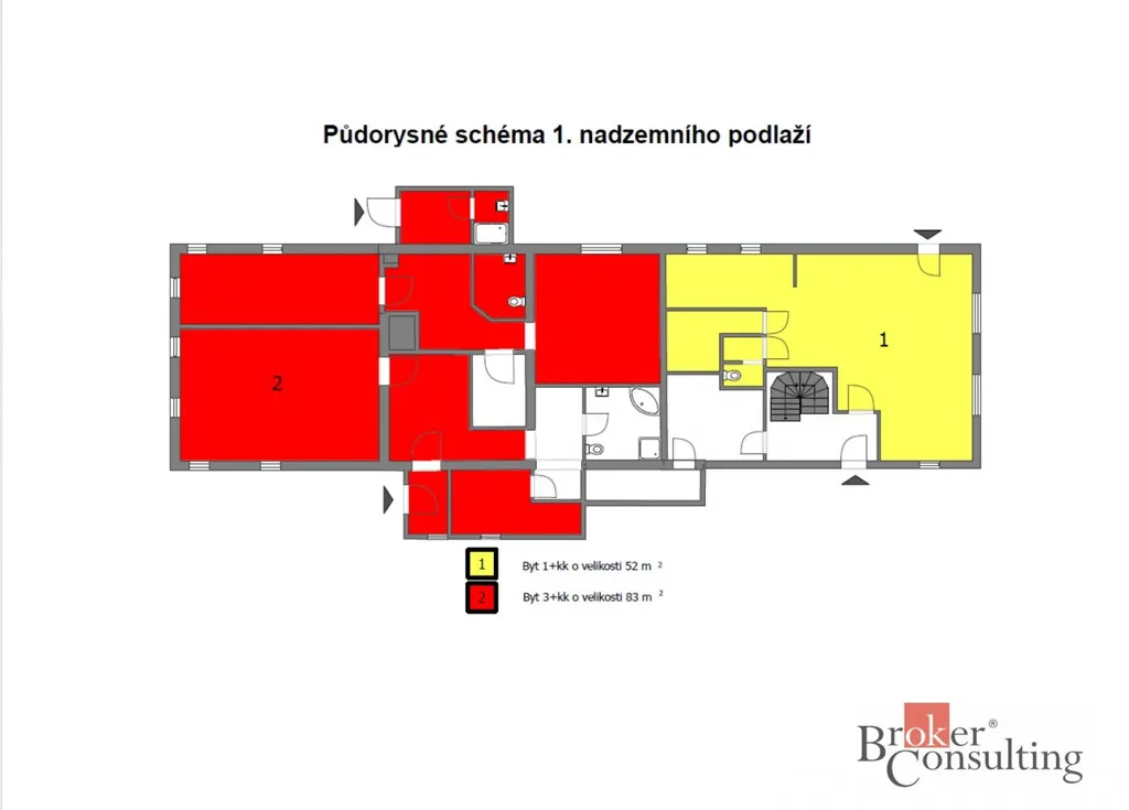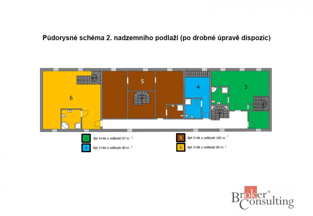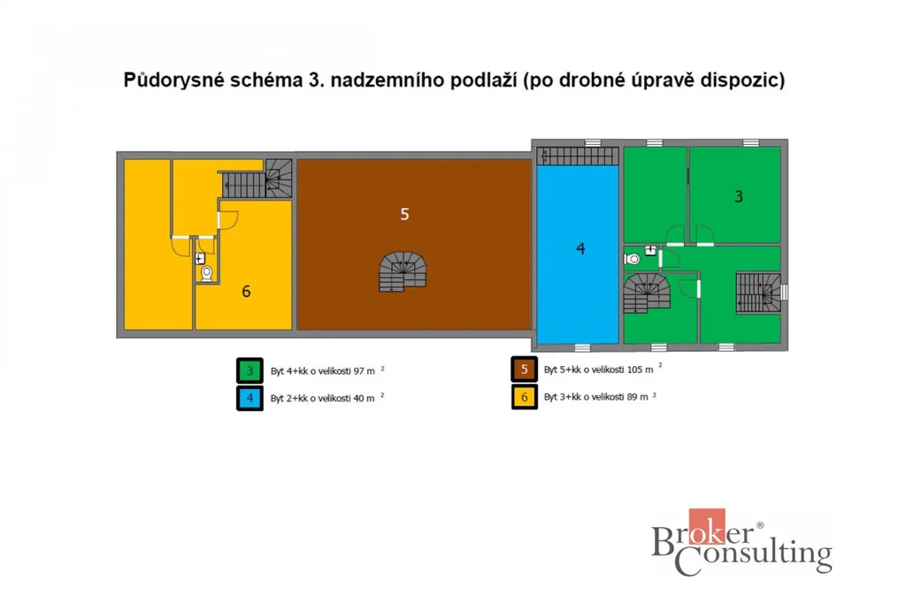 Nabízí se tedy ideálně provést drobné investice za účelem vzniku samostatných bytových jednotek dispozičně od 1+KK až po 5+KK s tím, že v 1. nadzemním podlaží se nachází 2 byty a zázemí pro tento dům (kotelna na pelety s automatickým podavačem) následně v dalších nadzemních podlažích jsou další 4 byty. Většina mezonetových a s ohledem budoucího řešení je vhodné změnit drobně dispozice některých bytů tak, aby prostory byly funkční. Zákresy jsou již prezentovány po dispozičních úpravách.