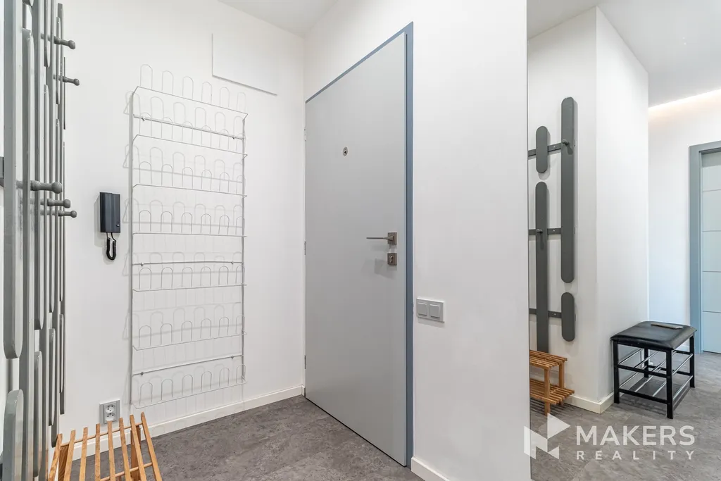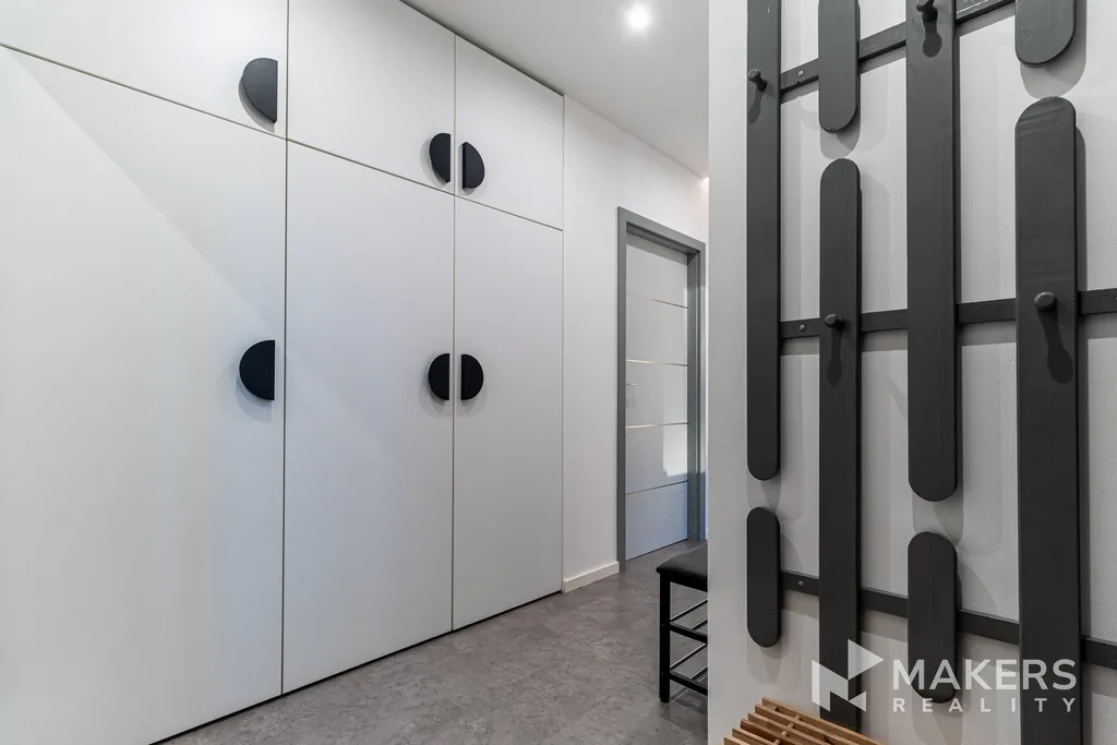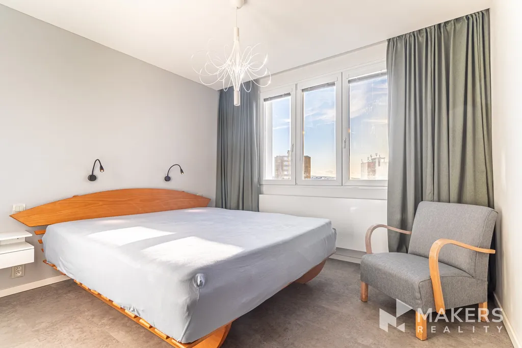 Dispozice nabízí prostorný obývací pokoj se západně orientovanou lodžií, která je ideálním místem pro večerní relaxaci. Součástí je nová sedací souprava s elektrickým výsuvem. Hlavní ložnice disponuje vlastní walk-in šatnou a postelí, druhý pokoj orientovaný na severovýchod může sloužit jako další ložnice, dětský pokoj nebo pracovna — ideální řešení i pro práci z domova.