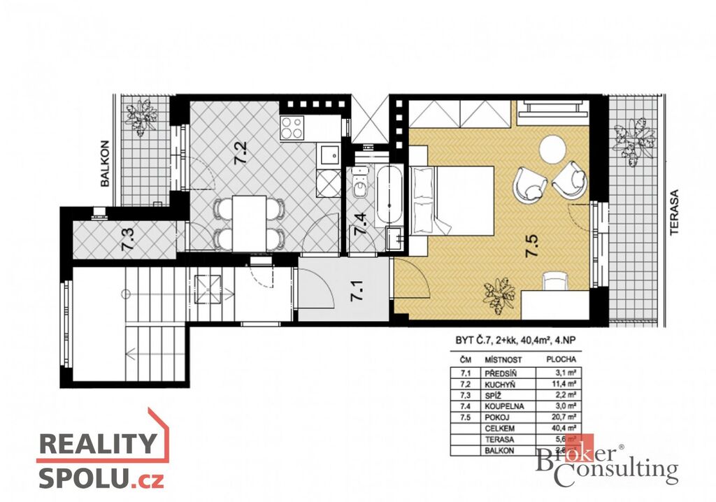 Pronájem bytu 1+1 se 2 terasami a klimatizací, na jednom z nejklidnnějších a nejpříjemnějších míst širšího centra Prahy: nedaleko Pankráce, u parku Jezerka.