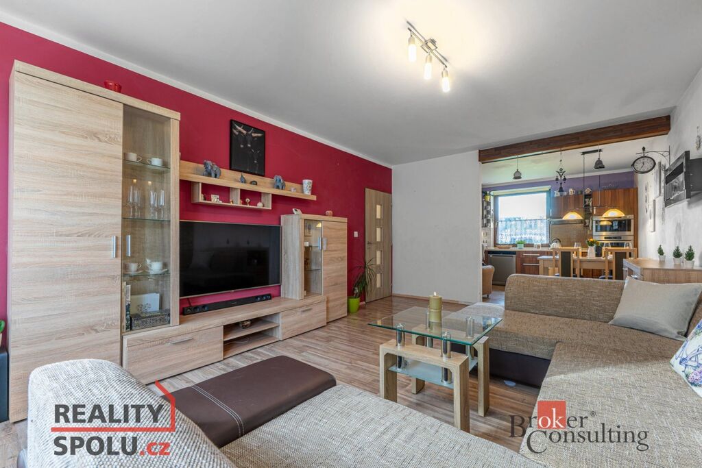 Dominantou bytu je velký, otevřený prostor obývacího pokoje propojený s kuchyní a jídelnou. Kuchyňská linka ve tvaru U nabízí dostatek pracovní plochy a je vybavena vestavnými spotřebiči včetně myčky, trouby, varné desky a digestoře. Obývací část je světlá a poskytuje dostatek prostoru pro pohodlné rodinné zázemí.