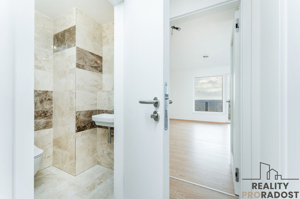 Designové koupelny: Koupelny jsou vybaveny moderními velkoformátovými obklady a sanitární keramikou od renomovaných značek, což zajišťuje elegantní a snadno udržovatelný prostor.