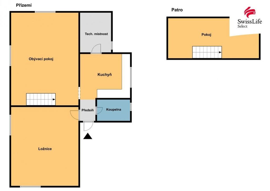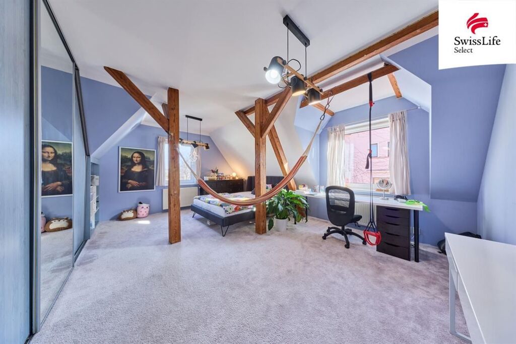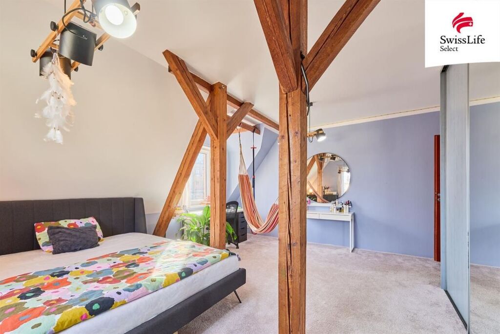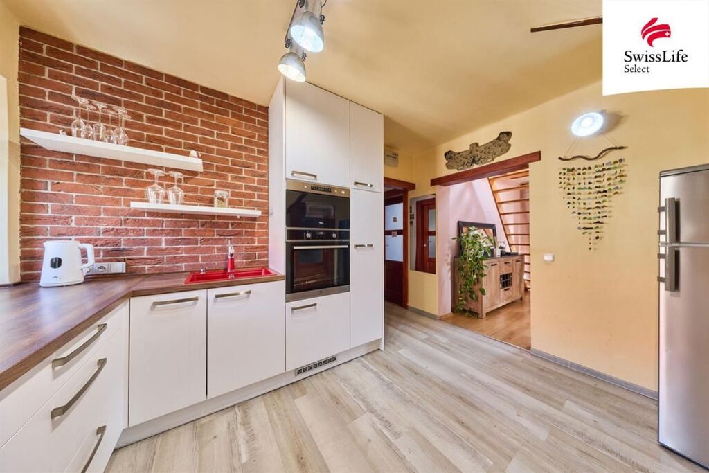 Dispozice: vstupní chodba, kuchyně s novou kuchyňskou linkou, technická místnost, koupelna s vanou a WC, prostorná ložnice a obývací pokoj. Z obývacího pokoje vede schodiště do mezonetového patra, kde se nachází další samostatný pokoj. K bytu náleží také sklep.