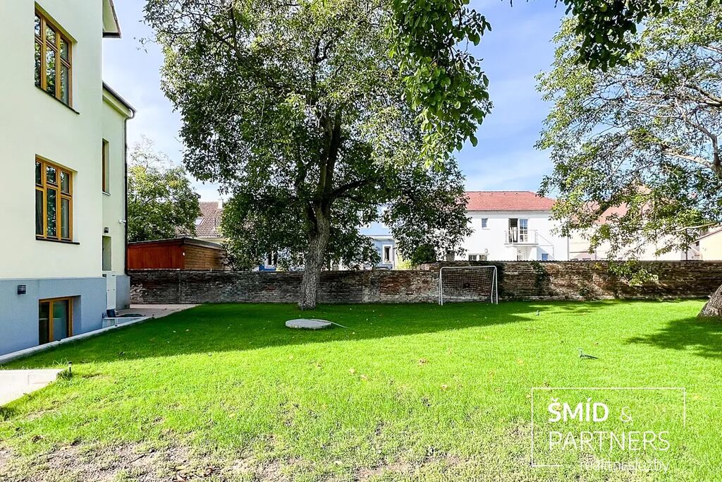 Kompletní rekonstrukce domu proběhla před dvěma lety, nově vznikly tři byty, ateliér, kanceláře a sauna. Byt je díky velkým Eurooknům a světlému interiéru příjemně prosluněný. Výhled do zahrady, která je stejně jako sauna k dispozici všem vlastníkům jednotek, je příjemným výhledem do zeleně. Byt je prostorný a je zde jasně vidět spolupráce s architektkou, vznikl velice vkusný a praktický byt, s obývacím pokojem a kuchyní, ložnice, koupelna s WC a komora. Kuchyň je vybavena troubou, mikrovlnou troubou, lednicí, myčkou a indukcí. Nejčastěji používaný materiál je zde dřevo, vč. podlahové krytiny, díky tomu působí byt příjemným a teplým dojmem. V ložnici je položený koberec. Celkově byl při rekonstrukci domu kladen důraz na kvalitu použitých materiálů.