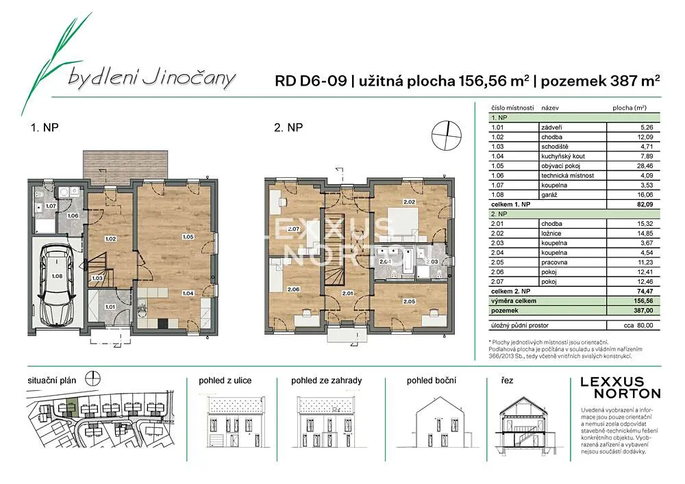 Dům s dispozicí 5+kk o celkové ploše 156,56 m² nabízí čtyři ložnice, tři koupelny, prostorný obývací pokoj s kuchyňským koutem, technickou místnost a dvě chodby. K domu náleží vlastní garáž, sedlová střecha s půdou a pozemek o velikosti 387 m².