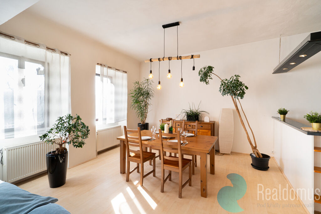 Ve druhém nadzemním podlaží se nachází prostorný a udržovaný byt 5+kk připravený k okamžitému nastěhování. Dispozici tvoří kuchyně s jídelním koutem a obývacím pokojem, ložnice, dva dětské pokoje a pracovna. Komfort zajišťují dvě koupelny – samostatná koupelna pro dětské pokoje a druhá přístupná z hlavní obytné části. Byt nevyžaduje okamžitou rekonstrukci.