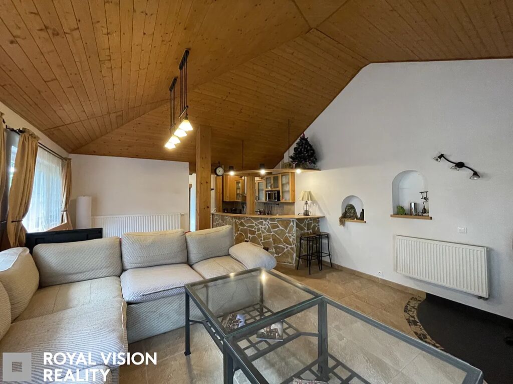 Obývací prostor rozdělený na dvě části: odpočinkovou zónou se sedací soupravou a konferenčním stolkem a spacím koutem.