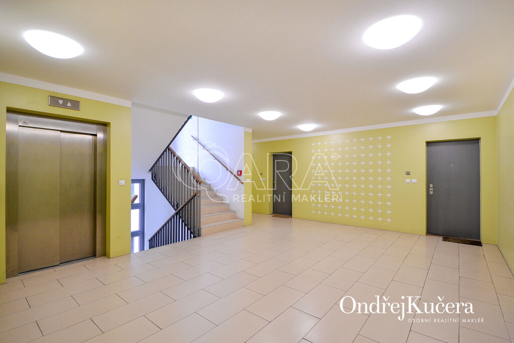 Byt má samostatnou ložnici a velký obývací pokoj. Z obou místností je vstup na balkon 4,5 m², který je orientovaný na západ. Všude jsou hliníková okna s předokenními roletami a podlahy z dřevěného masivu. Kuchyňská linka je plně vybavená veškerými spotřebiči a v koupelně je pračka. V praktické komoře jsou police a na chodbě bytu velká vestavěná skříň. K bytu nenáleží žádný sklep, ani garážové stání, ale občas je možné jej zajistit v rámci poptávky a nabídky přímo v domě na recepci.