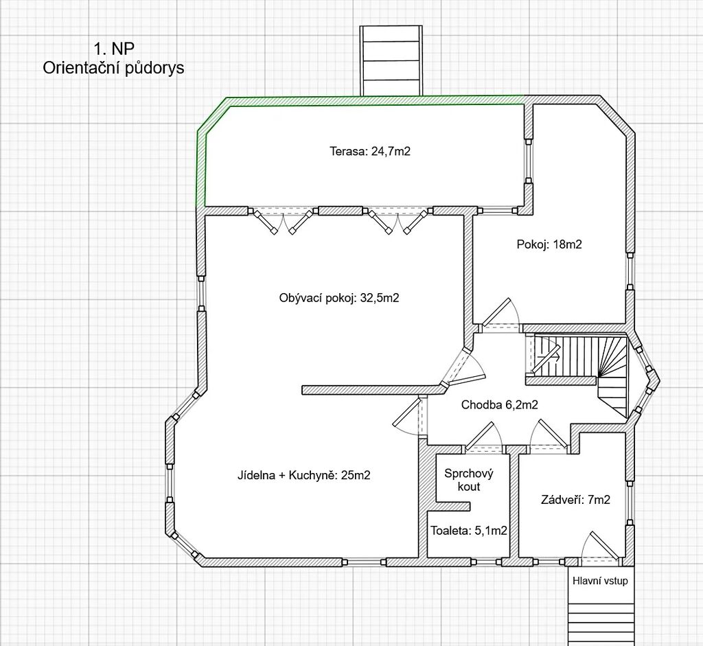 - prostorný obývací pokoj s krbovými kamny a vstupem na terasu a zahradu,