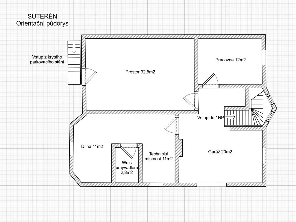 - velký multifunkční prostor o výměře 32,5 m² se širokými možnostmi využití, ze kterého je přímý vstup ke krytému stání pro dvě auta.