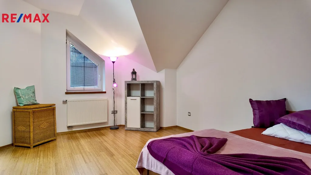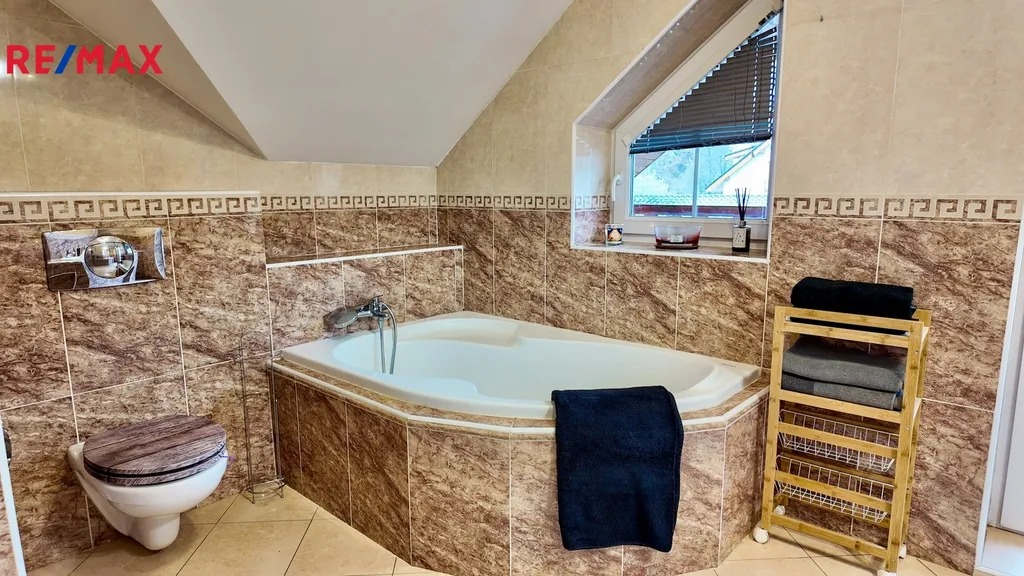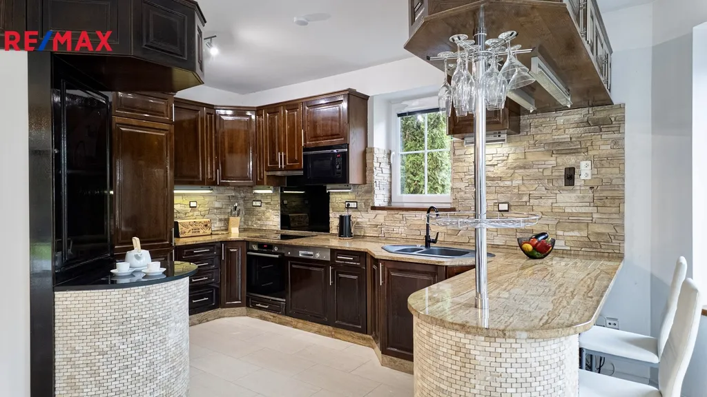 Nemovitost má dvě podlaží, v přízemí je dlažba s podlahovým vytápěním, v patře plovoucí podlahy a radiátory. K dispozici je vnitřní bazén, tři WC, dvě koupelny, tři klimatizace a plně vybavená kuchyně z masivu. V horním patře se nacházejí čtyři prosvětlené místnosti, z toho tři ložnice, a velká okna dodávají prostoru příjemně světlou atmosféru. Součástí domu je terasa, dva balkony a v interiéru se nachází i terárium.