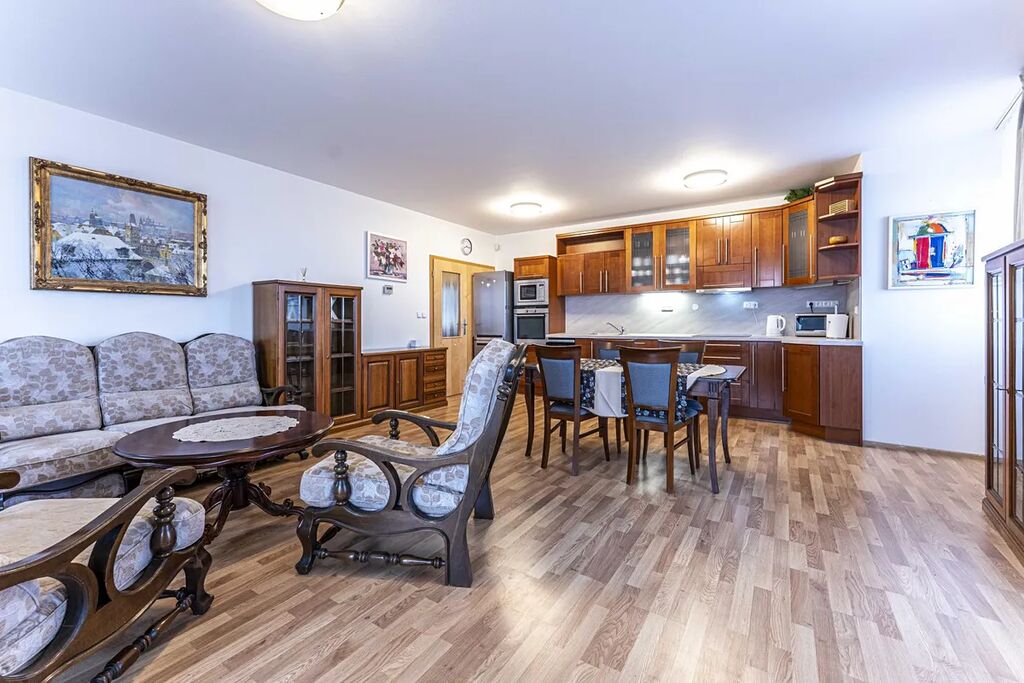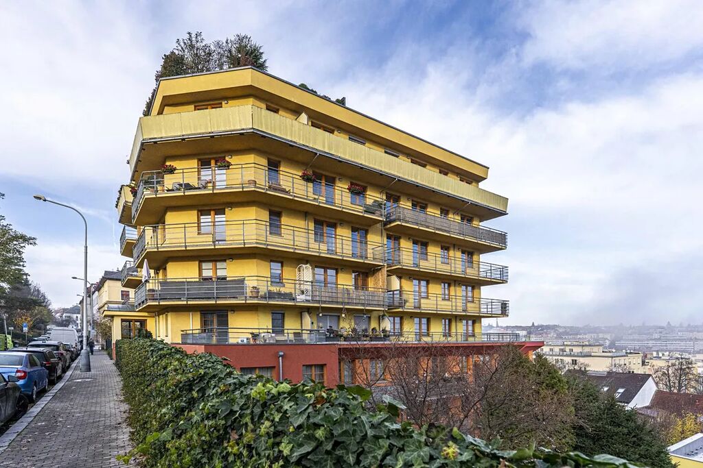 Byt obklopuje ze všech stran terasa s krásnými výhledy na okolní Břevnov, celkem i s terasou má byt cca 110 m2.