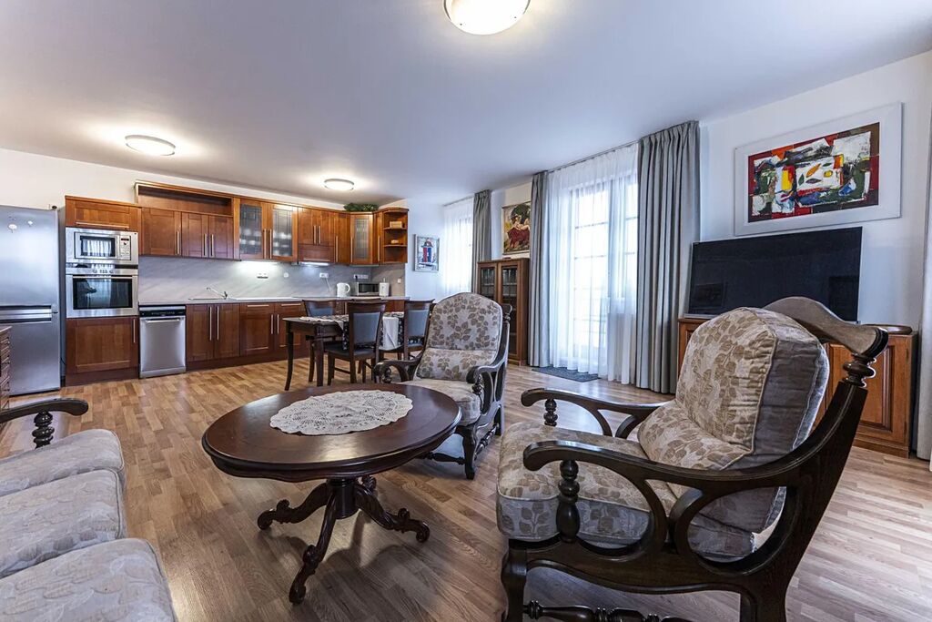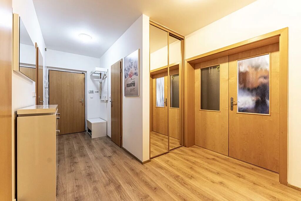 Dispozice: vstupní chodba se vstupy do 2 ložnic, technické místnosti vybavené pračkou i sušičkou, obývacího pokoje s kuchyňskou linkou zařízenou běžnými spotřebiči.