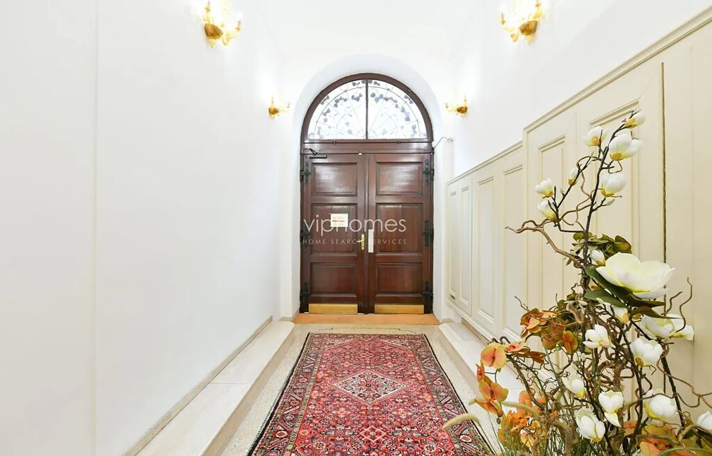 Dispozice: obývací pokoj s jídelním prostorem a plně vybavenou kuchyní, 2 ložnice, 2 koupelny, hlavní ložnice s vanou, toaletou a bidetem, druhá ložnice ze sprchovým koutem, bidetem, a toaletou, technická místnost. Byt je kompletně vybavený nábytkem a spotřebiči, (nechybí sporák, digestoř, myčka, horkovzdušná a mikrovlnná trouba, lednice s mrazákem, pračka, televize). Stylový interiér bytu rezonuje s historickými prvky budovy.