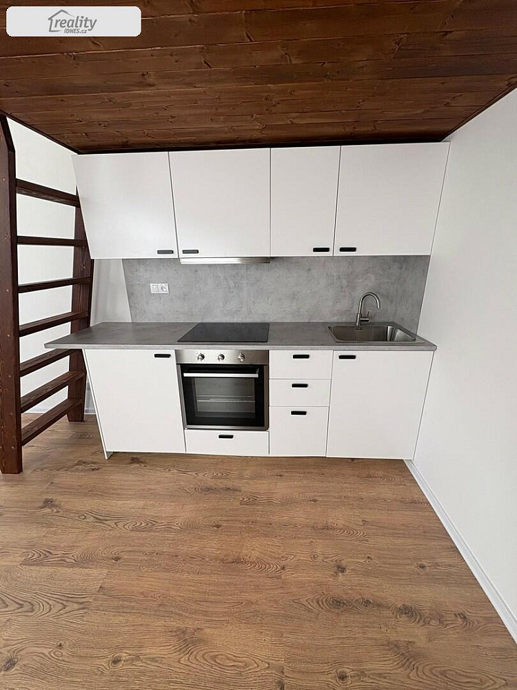Místo pro spaní je vyřešeno mezonetovou vestavbou, díky níž je v bytě dostatek prostoru jak pro kuchyňskou linku, tak i pro obývací část či pracovní kout a úložný prostor.