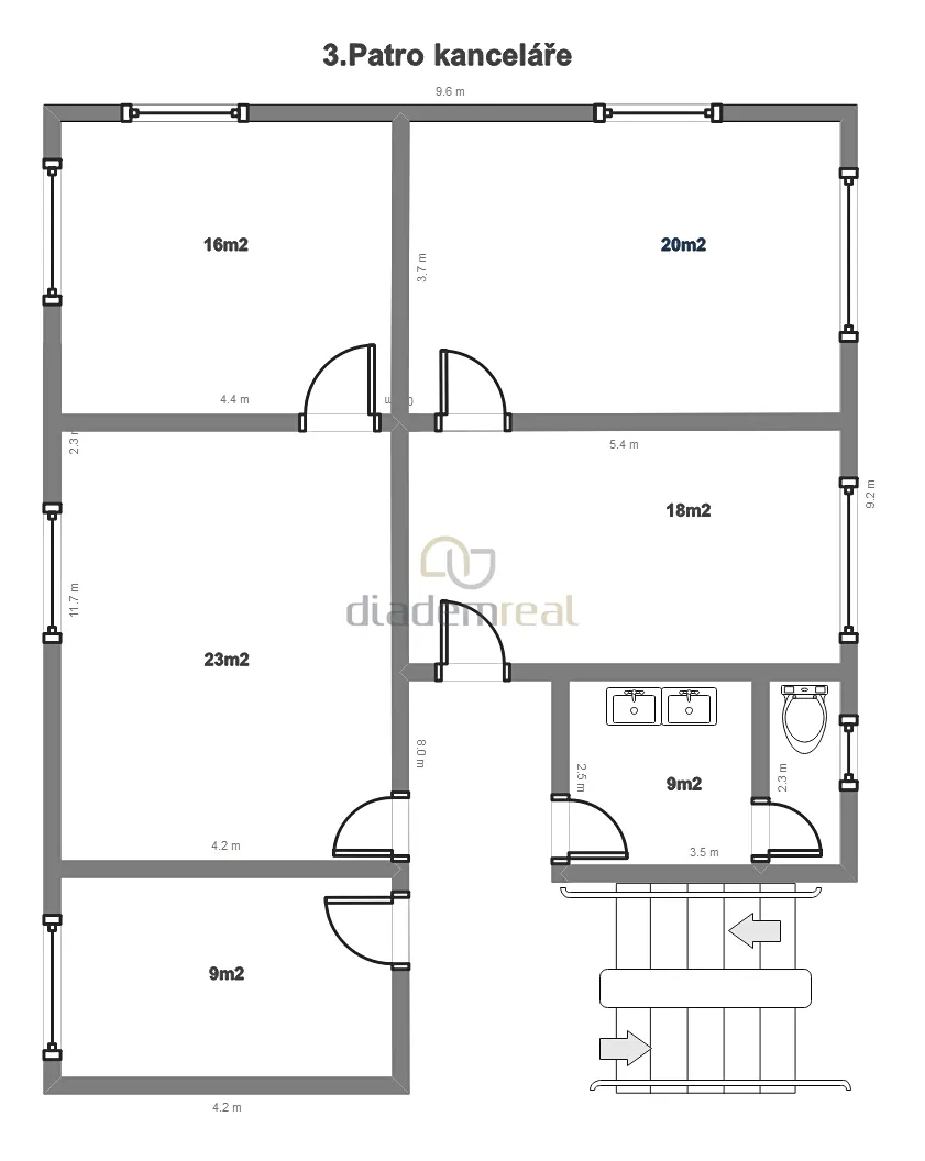 K dispozici jsou 4 kanceláře ve 2.podlaží o celkové velikosti 97 m2, včetně sociálního zázemí.