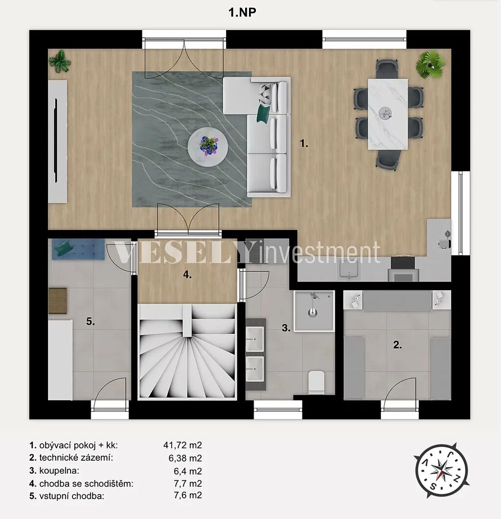 Vstup do domu tvoří vstupní chodba (7,6 m2) se vstupem do chodby se schodištěm (7,7 m2), ze které se dostanete do 2NP. Z chodby jsou dále vstupy do velkorysého obývacího pokoje s kuchyní (41,72 m2) a koupelny se záchodem (6,4 m2). V 1.NP se také nachází technická místnost (technické zázemí), která má vlastní vstup z pozemku.