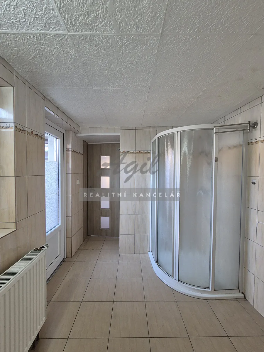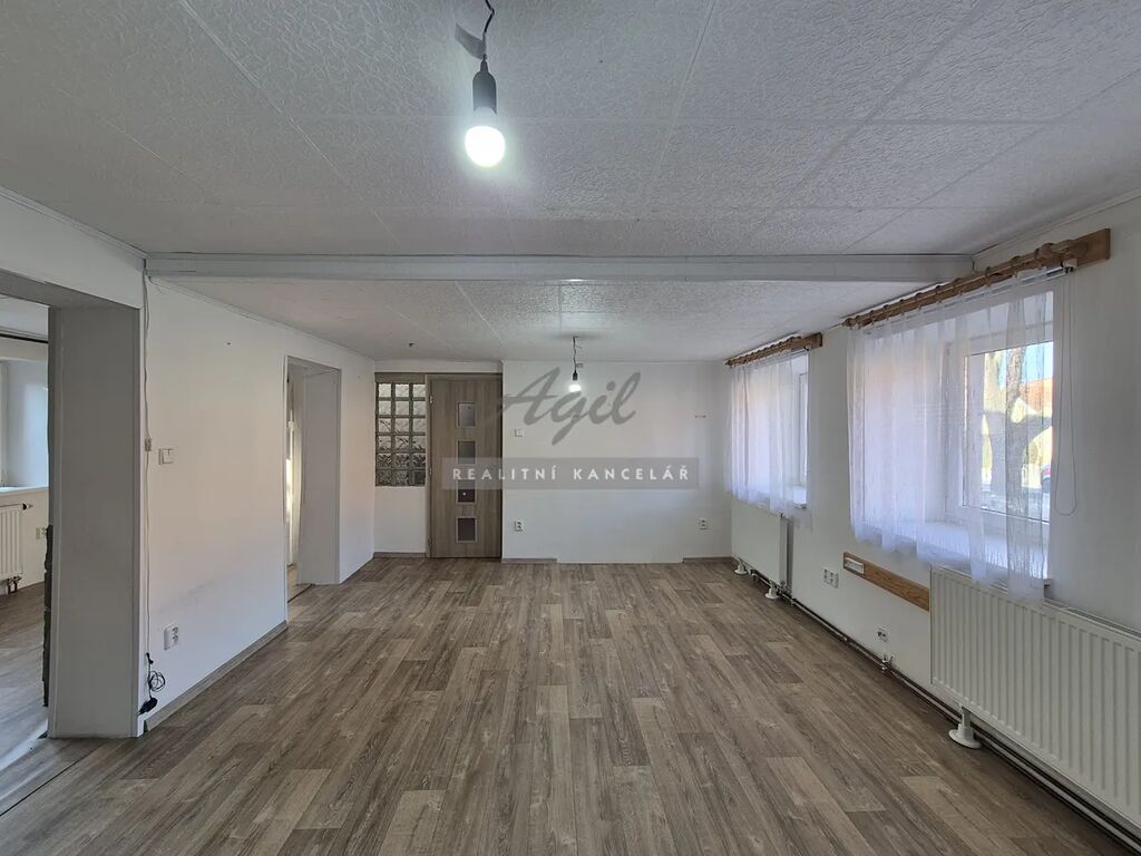 Vstupní chodba 7 m2 se schodištěm do patra, kuchyně s obývacím pokojem dohromady 21 m2, pracovna 12 m2, koupelna s WC dohromady 6 m2, sklep, dvorek 20 m2.