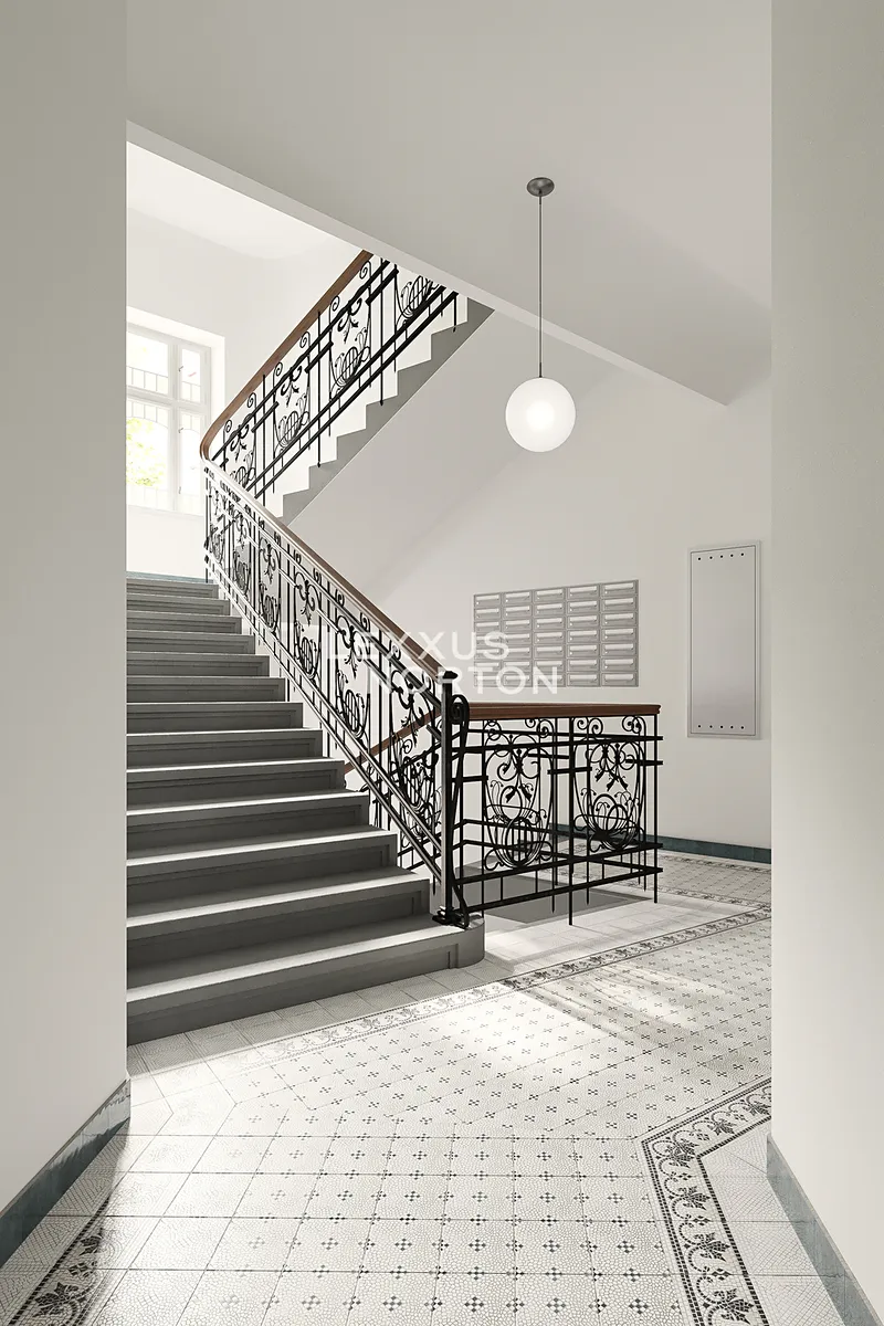 Secesní rohový dům prošel kompletní a citlivou rekonstrukcí, která zachovala původní architektonické prvky ve společných prostorách. Nový výtah zajišťuje pohodlný přístup do všech pater. Projekt je dokončen a byt je ihned k nastěhování.