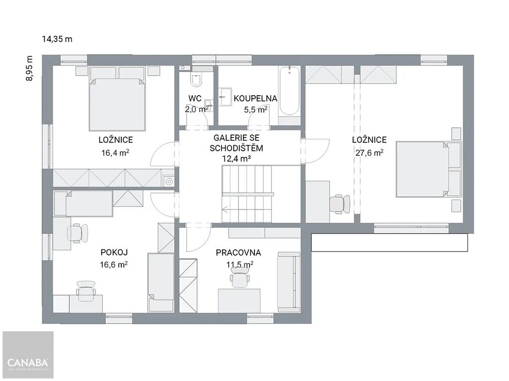V přízemí domu naleznete vstupní halu, velkorysý prosluněný obývací pokoj 33 m² s výstupem na zahradu, kuchyň 11,2 m², toaletu, technickou místnost, komoru a nesmí chybět ani šatna. V patře jsou k dispozici 2 ložnice. Z haly dále vstupujete do 2 dalších pokojů, velké koupelny s vanou a sprchovým koutem. Toaleta je zvlášť.