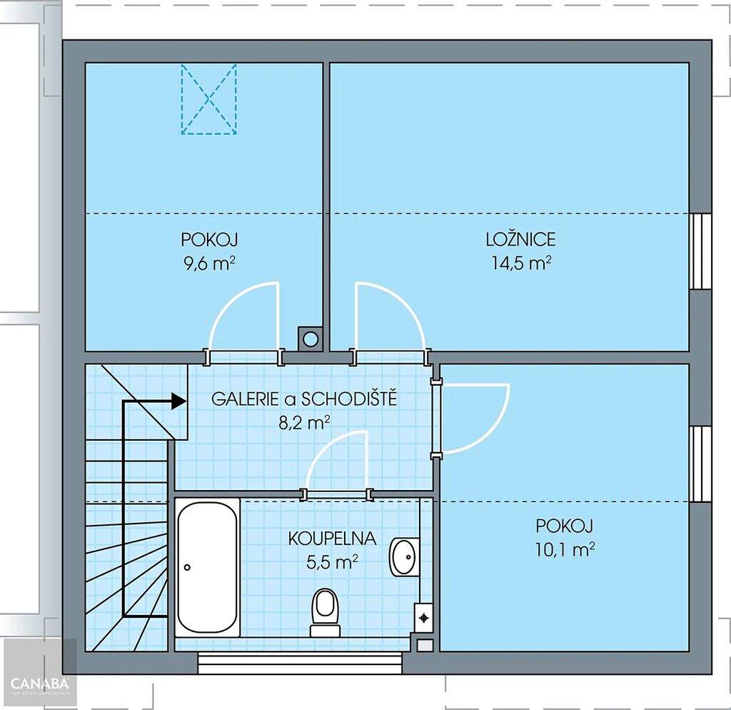 V patře je hlavní ložnice, dva samostatné dětské pokoje a další koupelna s vanou a druhou toaletou. Jednotlivé místnosti propojuje galerie, kam je možné umístit šatník.