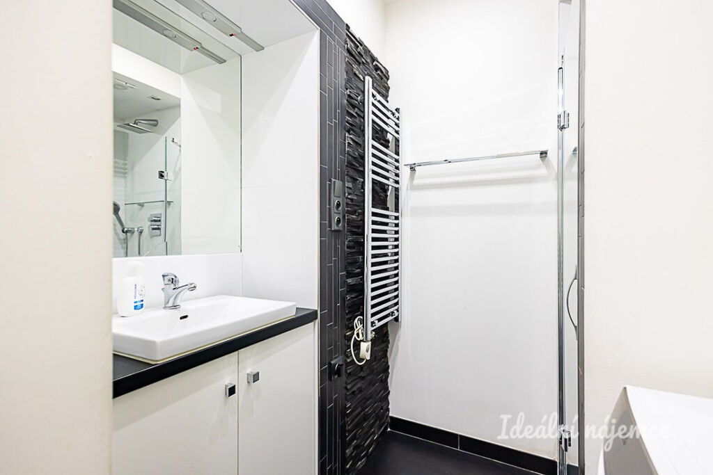 Byt se nabízí plně vybavený. Kuchyně disponuje lednicí s mrazákem, myčkou, kombinovaným sporákem, mikrovlnnou troubou a jídelním stolem s židlemi. V ložnici najdeme rozkládací pohovku, šatní skříň a křeslo. V koupelně je sprchový kout, umyvadlo, zrcadlo, koupelnová skříňka, pračka a WC. V předsíni je věšák, botník a zrcadlo.