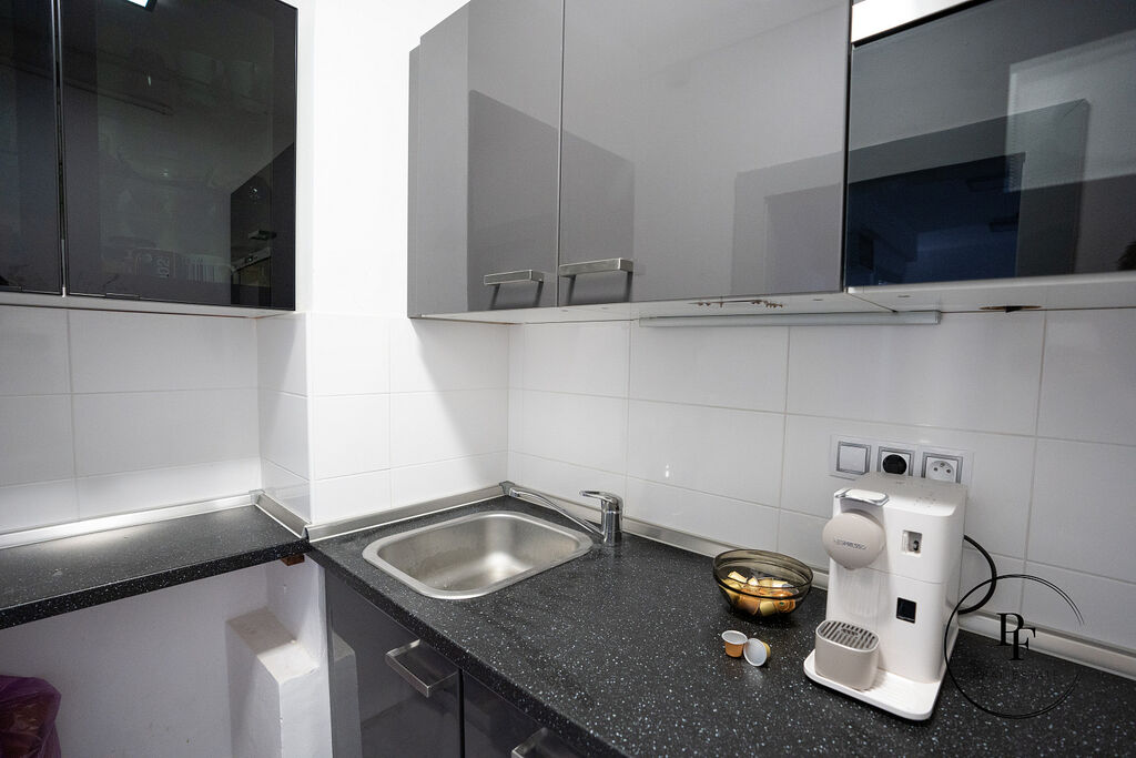 kuchyňku – vybavenou myčkou, úložnými skříňkami, mikrovlnkou a kávovarem
