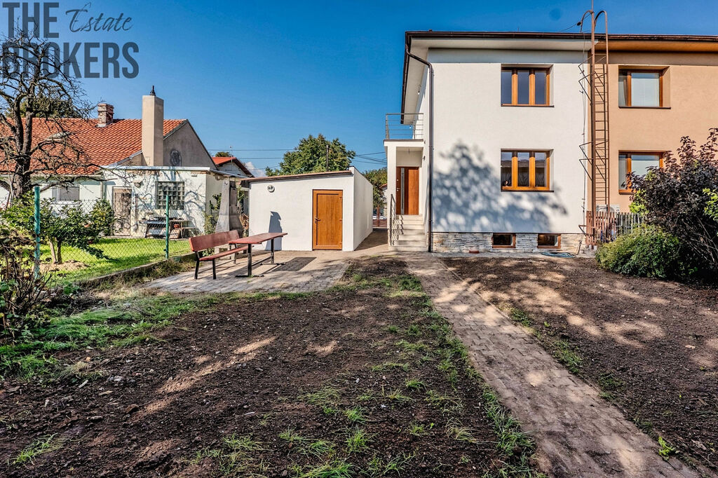 Součástí je také garáž s dílnou (31 m²) a menší přístavek, oba opravené a vymalované. Dům je napojený na obecní vodovod i kanalizaci, vytápění zajišťuje plynový kotel po revizi (červenec 2025) a ohřev vody bojlerem.