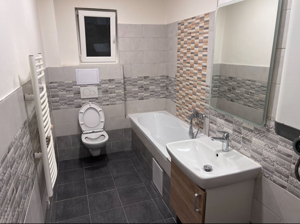 Byt nabízí praktické řešení, které zahrnuje obývací pokoj s kuchyňskou linkou, prostornou ložnici, koupelnu s vanou a WC a komoru. Všechny místnosti jsou světlé a nabízejí dostatek prostoru pro pohodlné bydlení.