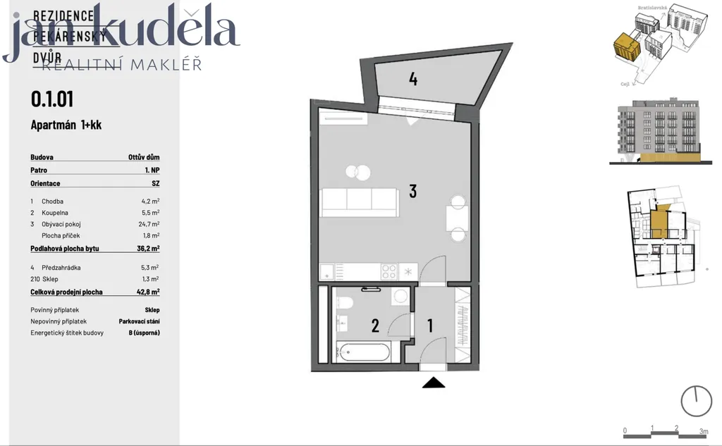 Nabízíme k pronájmu moderní byt o velikosti 1+kk (36,2 m²) s vlastní předzahrádkou a sklepní kójí, který se nachází ve vyhledávaném rezidenčním projektu Pekárenský dvůr na ulici Bratislavská. Byt je situován do klidného vnitrobloku a poskytuje soukromí i pohodlí v rámci nově vzniklé uzavřené rezidenční čtvrti.