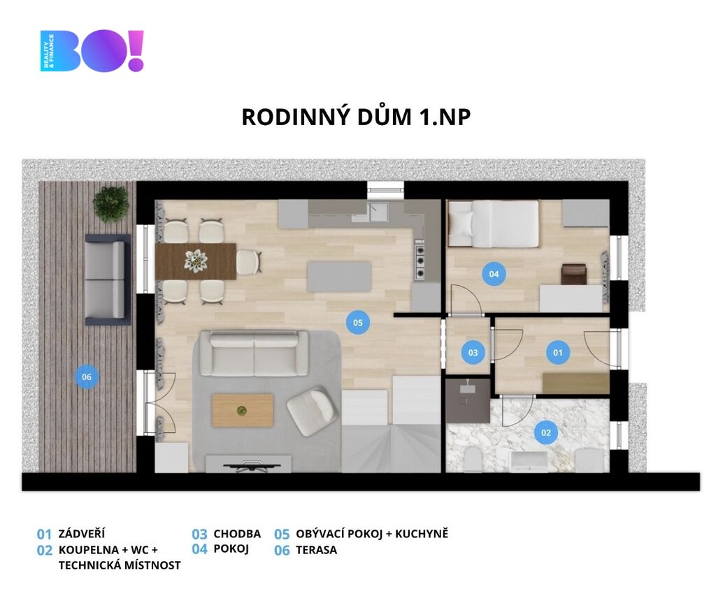 V přízemí se nachází zádveří, vstup do koupelny a technické místnosti, pokoj, prostorný obývák s jídelnou a kuchyňským koutem. Výstup na terasu s výhledem do zahrady.