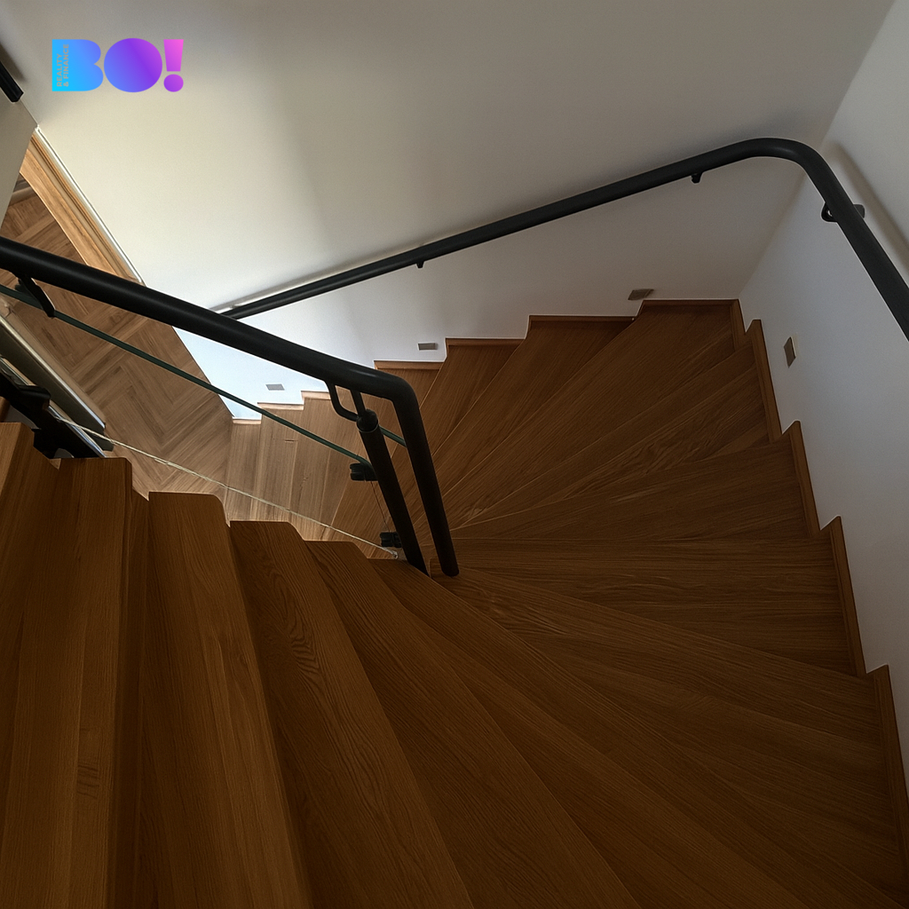 Do prvního patra vede točené schodiště a z něj se přes chodbu dostanete do třech pokojů a koupelny.