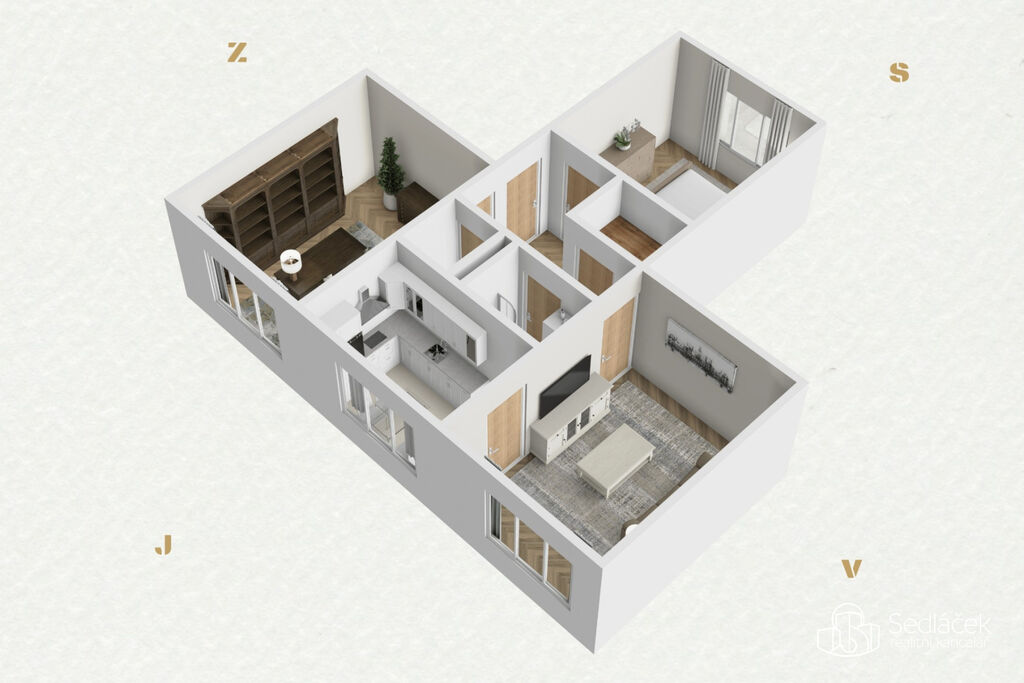 V koupelně se nachází sprchový kout, místo pro pračku, WC je řešeno samostatně. Předsíň nabízí velkou šatnu, kterou lze využít také jako komoru – skvělý bonus pro pohodlné ukládání sezónních věcí i domácích potřeb.