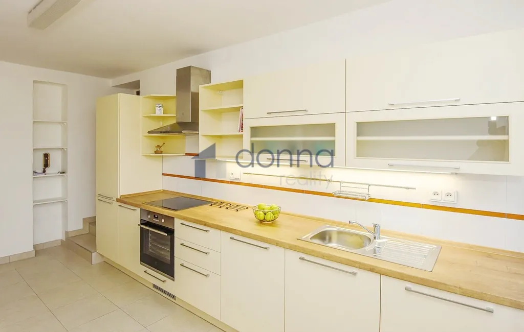Prostorná vstupní chodba (8m²), hala s novou vestavěnou skříní (9,5m²), koupelna se sprchovým koutem a toaletou (7m²), prádelna (4,5m²) a zcela nová kuchyň s vestavěnými spotřebiči (elektrická varná deska, trouba, myčka). Velkorysý obývací pokoj s jídelnou o výměře 40m² je prosvětlený po celý den a nabízí krásný výhled do zahrady a směrem k Modřanské rokli díky velkým francouzským oknům.