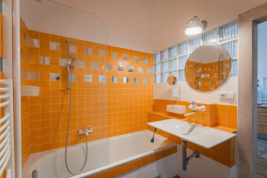 Interiér bytu je nezařízený, vybavení tvoří skříně, kuchyně se spotřebiči a jídelním stolem. Dispozici bytu tvoří dvě slunné místnosti s orientací do ulice na jihozápad a rozlehlá vstupní hala, malý dětský pokoj s vestavěným patrem a kuchyně, které jsou orientovány do krásného zeleného dvora na severovýchod, tímto směrem je i velký balkon (5,38 m2). Dále je v bytě samostatná toaleta a koupelna. Do ulice je orientován obývací pokoj s arkýřem ( vestavěné patro bude odstraněno) a druhý pokoj, kde je atiková, nahoře prosklená zeď (umožňující volný průchod denního světla), co rozděluje pokoj na ložnici a šatnu. Malý pokoj orientovaný do dvora lze využít jako dětský pokoj (má vestavěné spací patro) či jako pracovnu. Dále k bytu náleží sklep 12 m2.