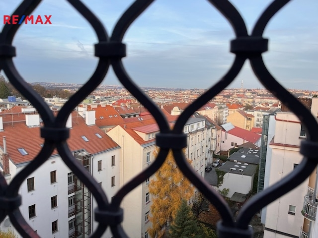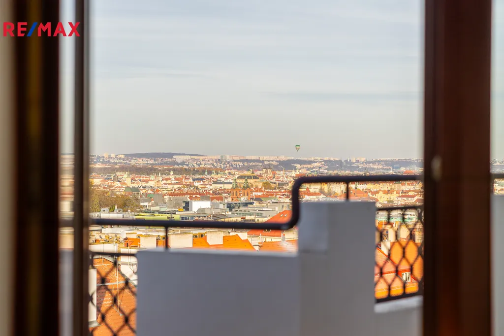 Hlavním lákadlem bytu je však prostorná střešní terasa o velikosti 18m2, která je umístěna do vnitrobloku a nabízí výjimečný a nerušený výhled na celou Prahu. Výhledově bude společenství vlastníků jednat o instalaci výtahu.