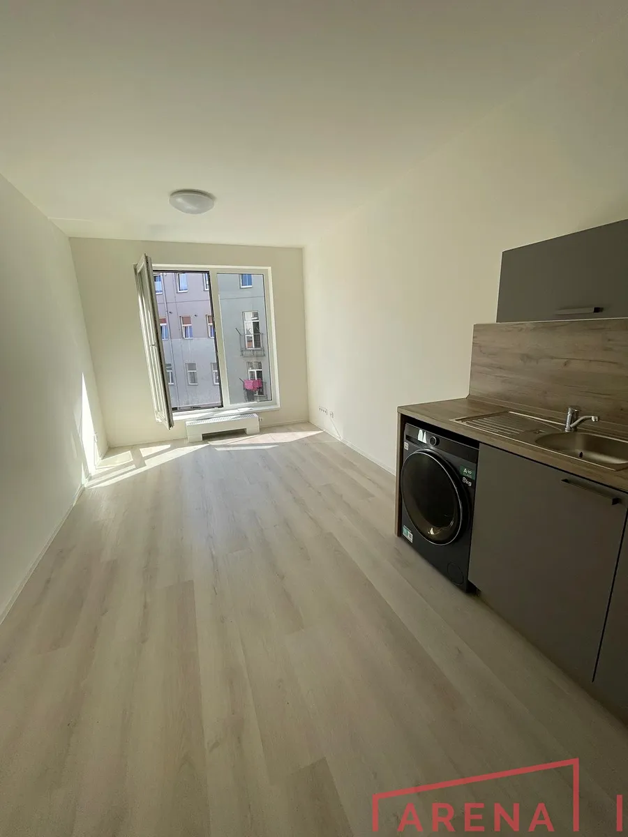 Dispozice: pokoj s kuchyňským koutem 17,5 m2, koupelna 3,1 m2, zádveří 7,4 m2