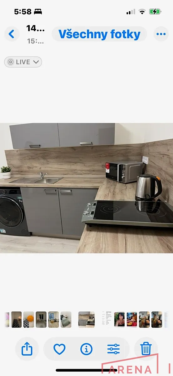 • kuchyňská linka vybavená dvouplotýnkovým vařičem a lednicí, pračkou, mikrovlnou troubou a varnou konvicí