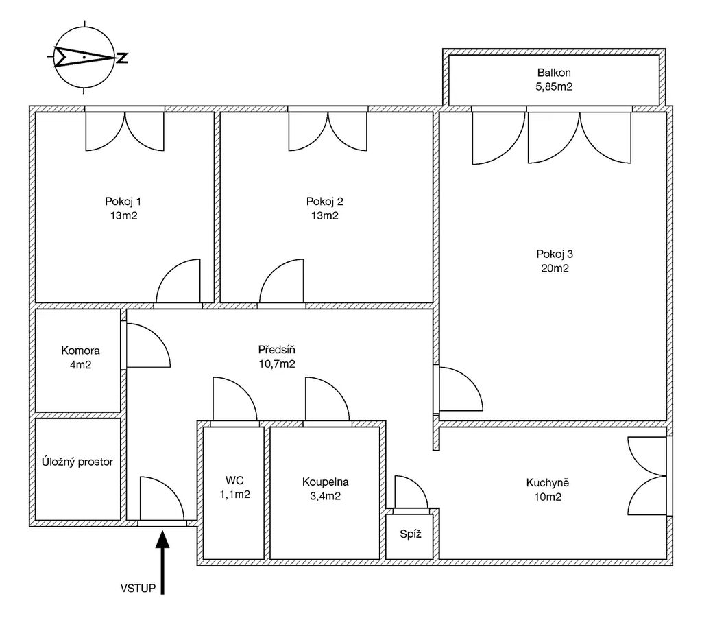 Do bytu vstupujeme prostornou předsíní, ze které vedou samostatné, neprůchozí vstupy do všech pokojů, kuchyně, koupelny i samostatného WC. Jednotlivé místnosti nabízejí dostatek soukromí – ideální jak pro rodinu, tak třeba pro spolubydlení nebo práci z domova.