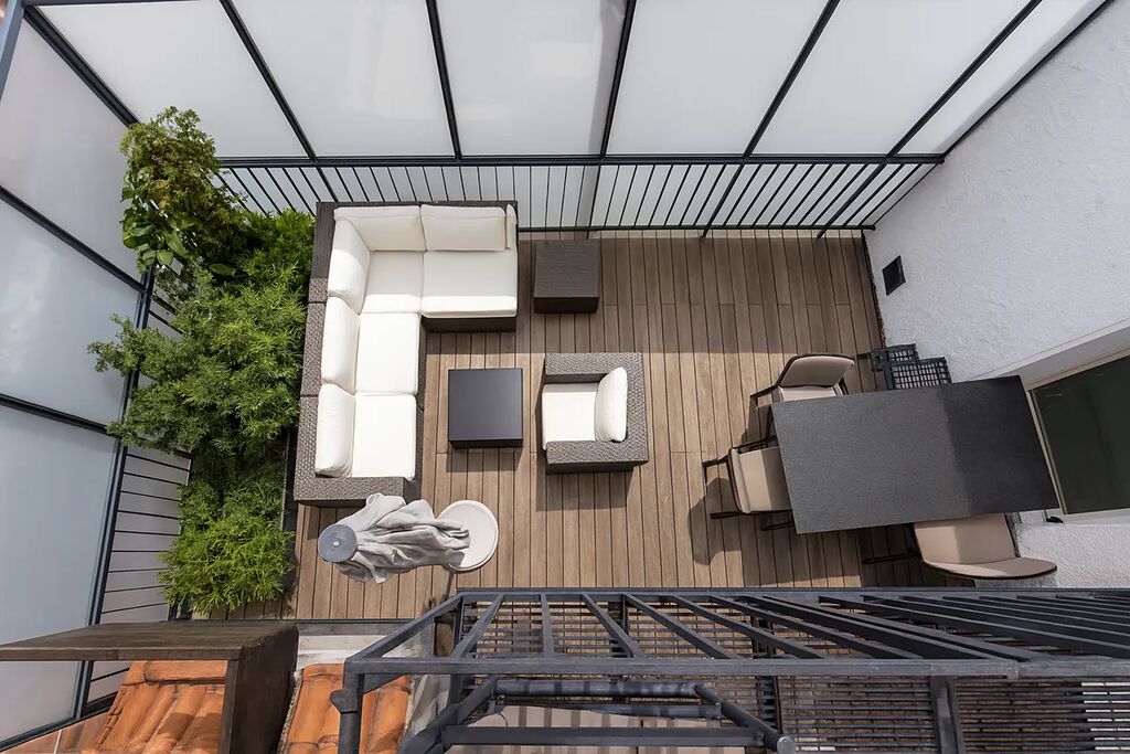 Byt se pyšní panoramatickým 360° výhledem na celou Prahu a prošel kompletní renovací před šesti lety. Po vstupu do bytu vás přivítá předsíň, ze které se po několika schodech dostanete do soukromého wellness se saunou. Hlavní obytný prostor tvoří prostorný obývací pokoj s mramorem obloženým krbem a plně vybavenou kuchyní značky Miele, kde stěny zdobí elegantní benátský štuk. Snídaně si můžete vychutnat na jednom ze dvou balkonů s působivým výhledem na historické památky Starého Města.