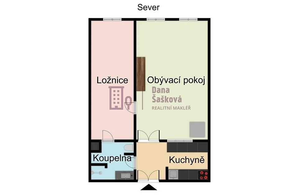 Dispozice 2+1 nabízí ložnici, obývací pokoj, kuchyni a koupelnu se sprchovým koutem a toaletou.