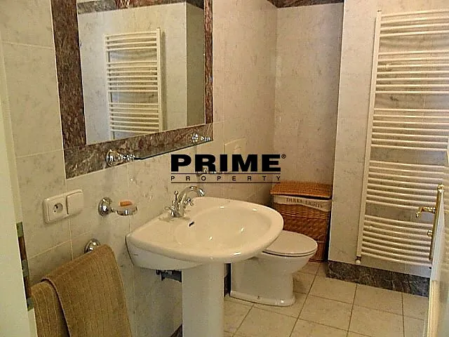 Dispozice bytu: vstupní předsíň, velký obývací pokoj s jídelní částí a vstupem na balkon s výhledem do parku, plně vybavená kuchyň se spotřebiči (sporák, myčka, mikrovlnná trouba a lednice s mrazákem), dvě ložnice orientované do klidného vnitrobloku se zahrádkou (jedna s balkonem, vestavěnou skříní a vlastní koupelnou: vana, umyvadlo, toaleta a bidet), druhá koupelna (se sprchovým koutem, umyvadlem, toaletou a bidetem) a prádelna (pračka a sušička).