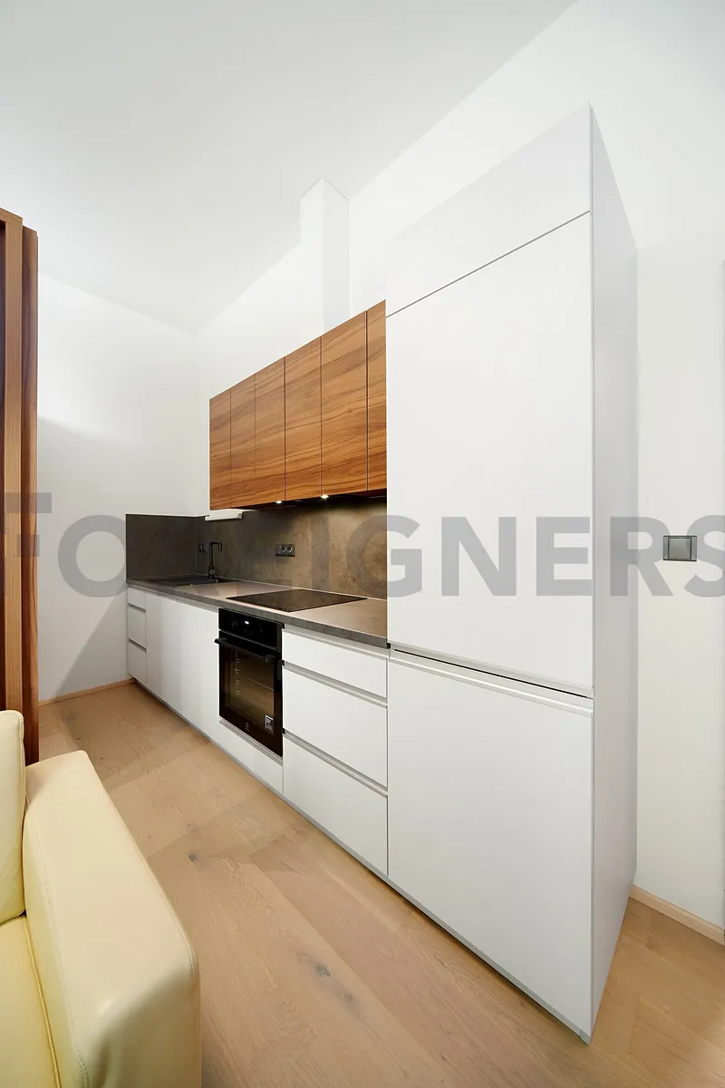 Byt nabízí moderní kuchyňskou linku vybavenou varnou deskou, troubou, lednicí s mrazákem, myčkou a mikrovlnnou troubou.
