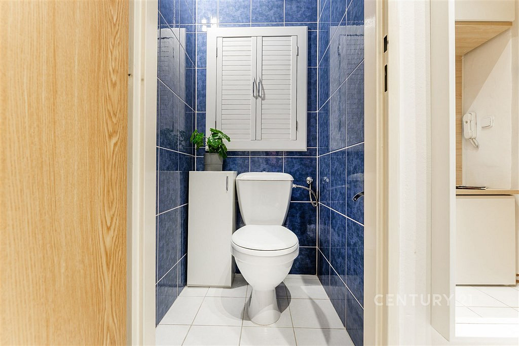 Koupelna a wc jsou oddělené, moderní předsíň disponuje nečekaně velkým úložným prostorem. Co nebudete potřebovat mít po ruce, uložíte do vlastního sklepa v suterénu s bezpečnostním přístupem.