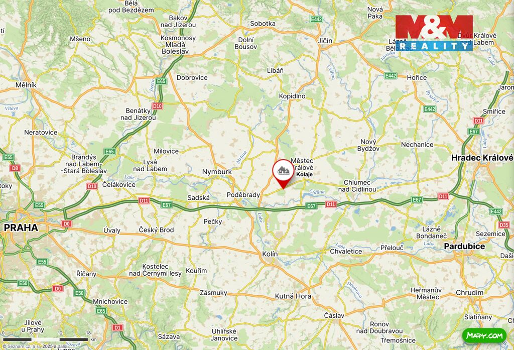 Pozemek leží 8 km od Poděbrad a pouhých 5 km od nájezdu na dálnici D11, což zajišťuje rychlé spojení do Prahy i Hradce Králové - dojezdová vzdálenost je přibližně 30 minut.