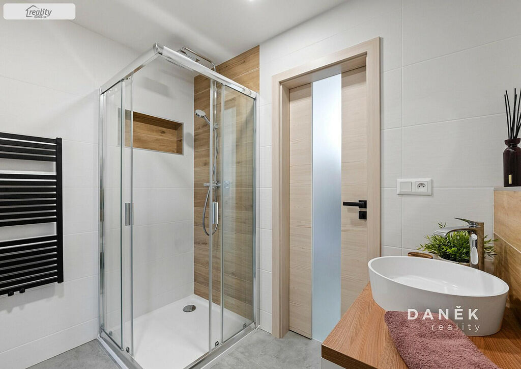 Interiér byl navržen s důrazem na detail, kvalitu a funkčnost – nabízí vyšší standard, než bývá běžně. Vinylové podlahy v celém domě. Designová kuchyně na míru, která je plně vybavená spotřebiči. Vestavěný nábytek, dýhované dveře Sapeli a kvalitní obklady. HS portál v antracitu – propojuje obývací prostor s terasou. Dvě koupelny – jedna s vanou, druhá se sprchovým koutem. Vinylový obklad schodiště, betonová stěrka a precizní řemeslné detaily. V domě se snoubí elegance, praktičnost a teplo domova – každý detail byl promyšlen.
