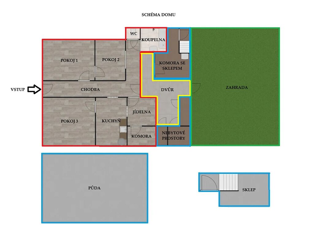 Vstupními dveřmi vejdeme do prostorné chodby o celkové ploše cca 14,2 m2, která propojuje hlavní obytné části domu. Po levé straně se nachází pokoj o výměře cca 16,42 m2, který může sloužit jako obývací pokoj či ložnice. Z tohoto pokoje je vstup do další místnosti o ploše cca 10,11 m2, vhodné jako ložnice, dětský pokoj, šatna nebo pracovna. Z již zmíněné chodby je dále přístup do kuchyně o rozloze cca 9,64 m2, kde je zároveň umístěn ohřev teplé vody. Z kuchyně vejdeme do prostorného pokoje o velikosti cca 22,47 m2, který lze využít jako hlavní obývací pokoj či další ložnici. Z kuchyně je také přístup do menší místnosti o celkové ploše cca 8,03 m2, jež může sloužit jako samostatná jídelna. Z této místnosti je vstup do komory o celkové ploše cca 4,34 m2 a zároveň je z ní možné projít zpět do hlavní chodby, což vytváří praktické dispoziční propojení. Chodba pokračuje ke koupelně o celkové ploše cca 4,2 m2 a samostatnému WC o celkové ploše cca 1,08 m2. Z chodby je vstup na soukromý dvůr, odkud se vchází do jednotlivých nebytových prostor. Z dvoru je přístup na půdu nad domem o výměře cca 68,52m2, která přímo vybízí k půdní nástavbě. Nachází se zde komora o rozloze cca 7,55 m2, ze které vedou schody do sklepa o celkové ploše cca 5,76 m2. Na dvoře jsou dále tři menší nebytové prostory o celkových plochách cca 5,13 m2, 4,78 m2 a 2,59 m2.