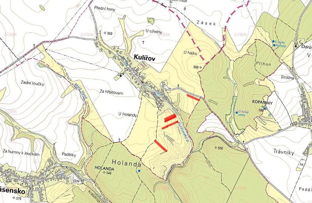 Jedinečná příležitost ke koupi pastvin. Pozemky leží v katastrálním území Kulířov v okrese Blansko, kraj Jihomoravský. Konkrétně jsou zapsány na listu vlastnictví 10 pod čísly parcel 410/60, 410/42, 398/34, 448/50, 406/53, 410/68, 410/56 a 410/59.