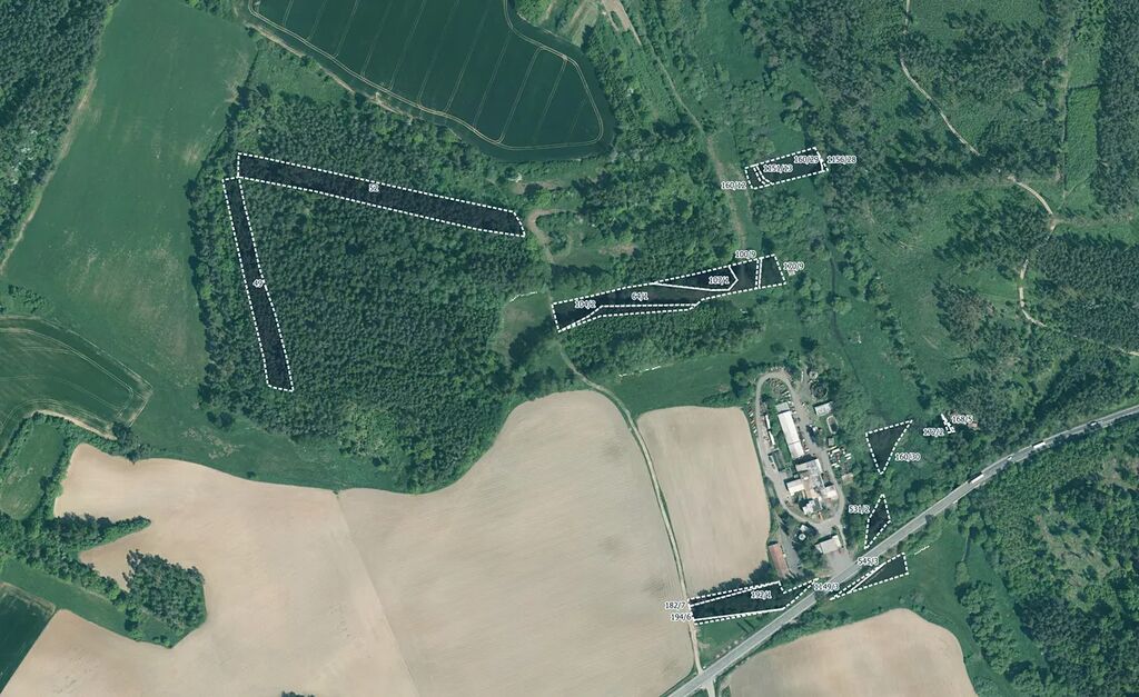 Pozemky jsou vedeny pod čísly 49, 52, 64/1, 100/9, 104/2, 107/1, 160/12, 160/29, 160/30, 168/5, 170/9, 172/2, 182/7, 192/1, 194/6, 238/1, 406/34, 406/40, 410, 485/4, 505/6, 531/2, 545/3, 558/3, 559/15, 584, 714/10, 720/6, 809/1, 1002/9, 1002/30, 1002/31, 1060, 1061, 1143/10, 1149/3, 1151/13, 1156/28, 1158/24 a 1158/25.