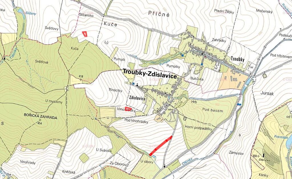 Pozemky jsou rozděleny na parcely č. 257, 301/38, 301/77, 301/86, 301/114, 301/115, 301/129, 301/160, 301/167, 301/172 a 695/36 v k. ú. Zdislavice a 418 v k. ú. Troubky, u obou KÚ se jedná o list vlastnictví 350.